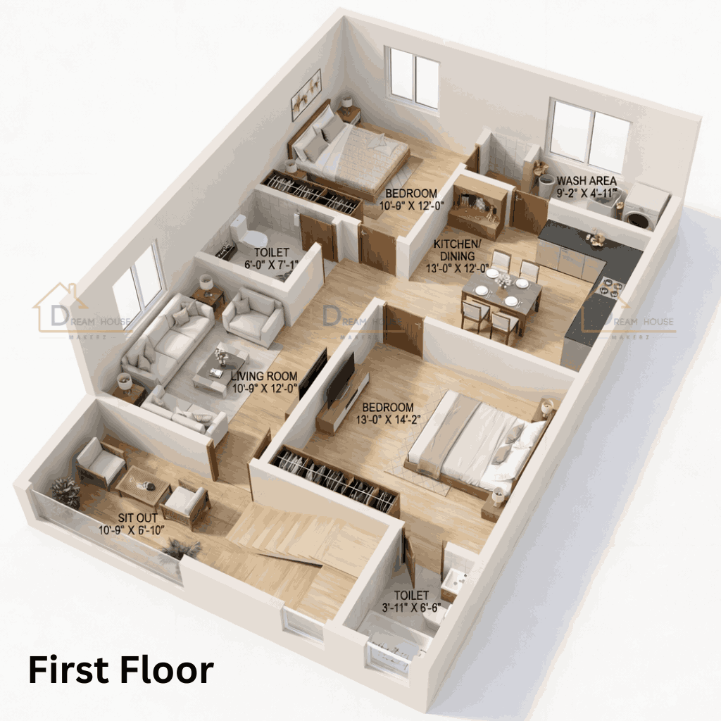Duplex 3-BHK Modern House 3D Floor Plan